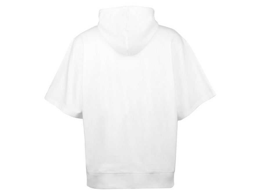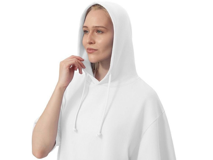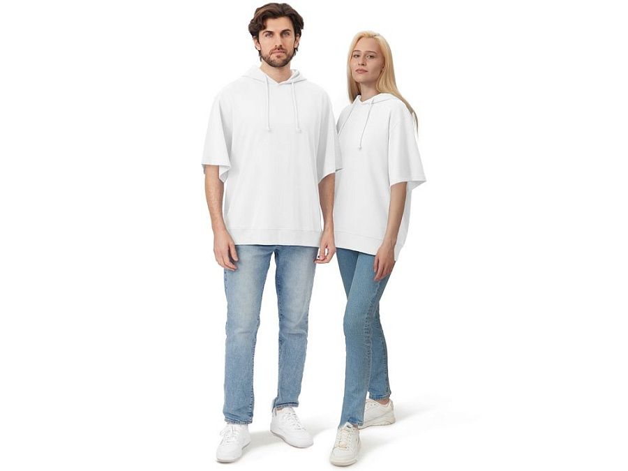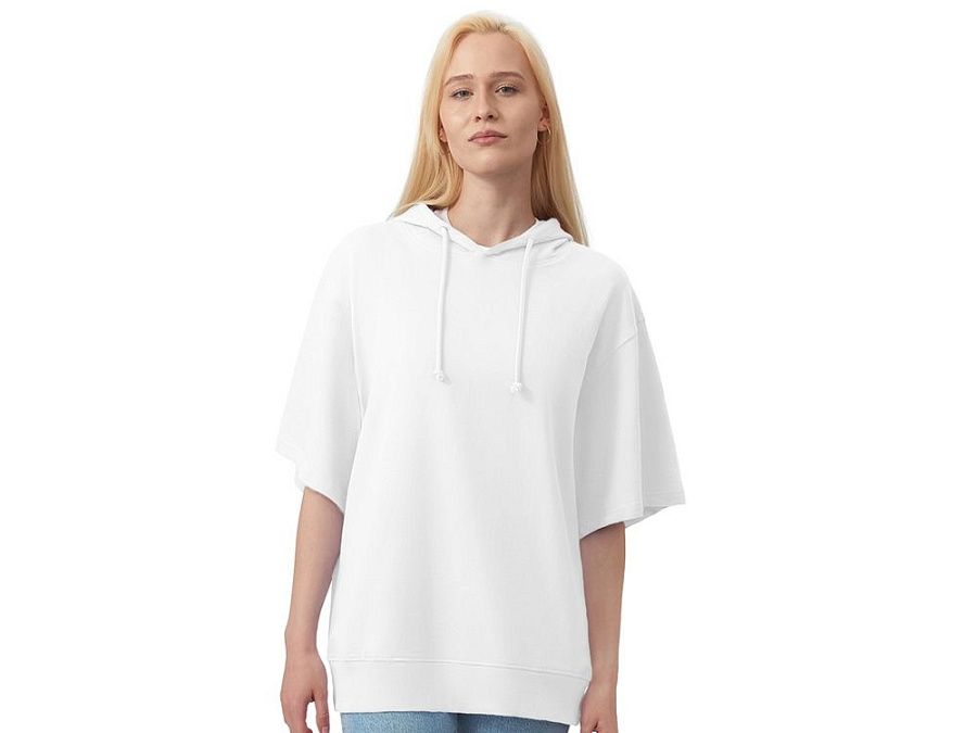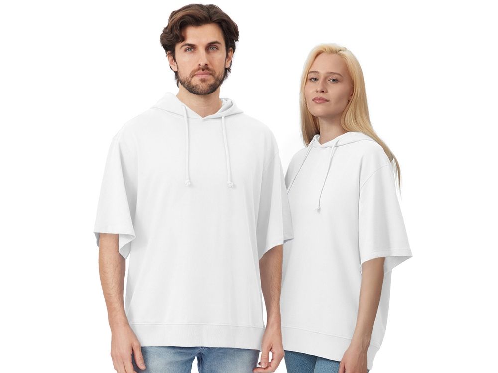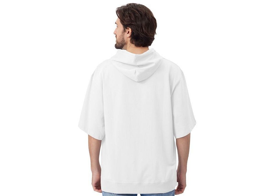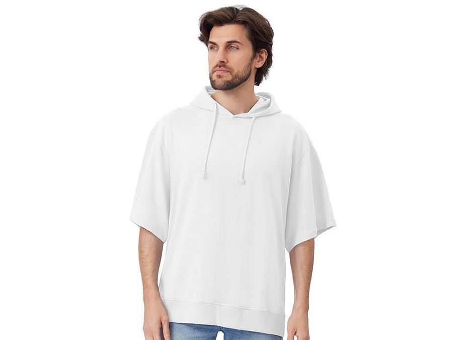 Худи с коротким рукавом выполнено из хлопкового френч терри с петельками на изнаночной стороне. Подкладка капюшона выполнена из основного полотна для объемной посадки. Модель комфортной и актуальной посадки оверсайз отлично подходит для обычной жизни и в качестве промо мерча.