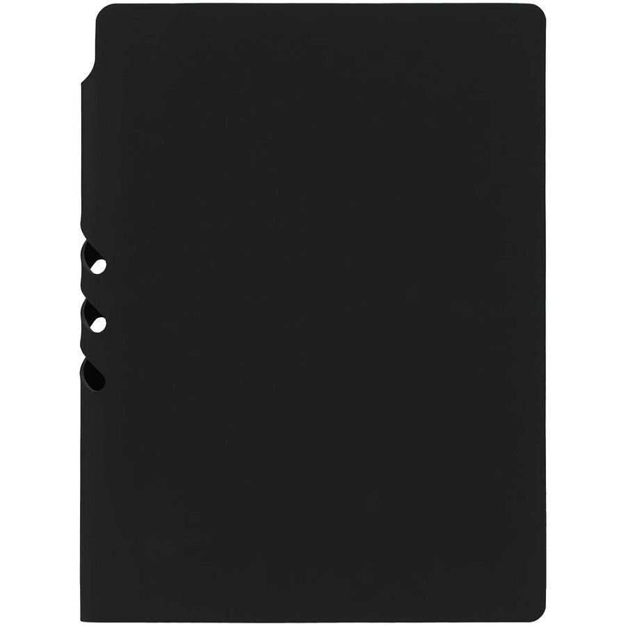 Гибкая обложка выполнена из материала Soft Touch, черный АА и Latte, черный АА (внутренняя часть обложки). Внутри корешка — специальное место для крепления ручки размером до 15х1 см.