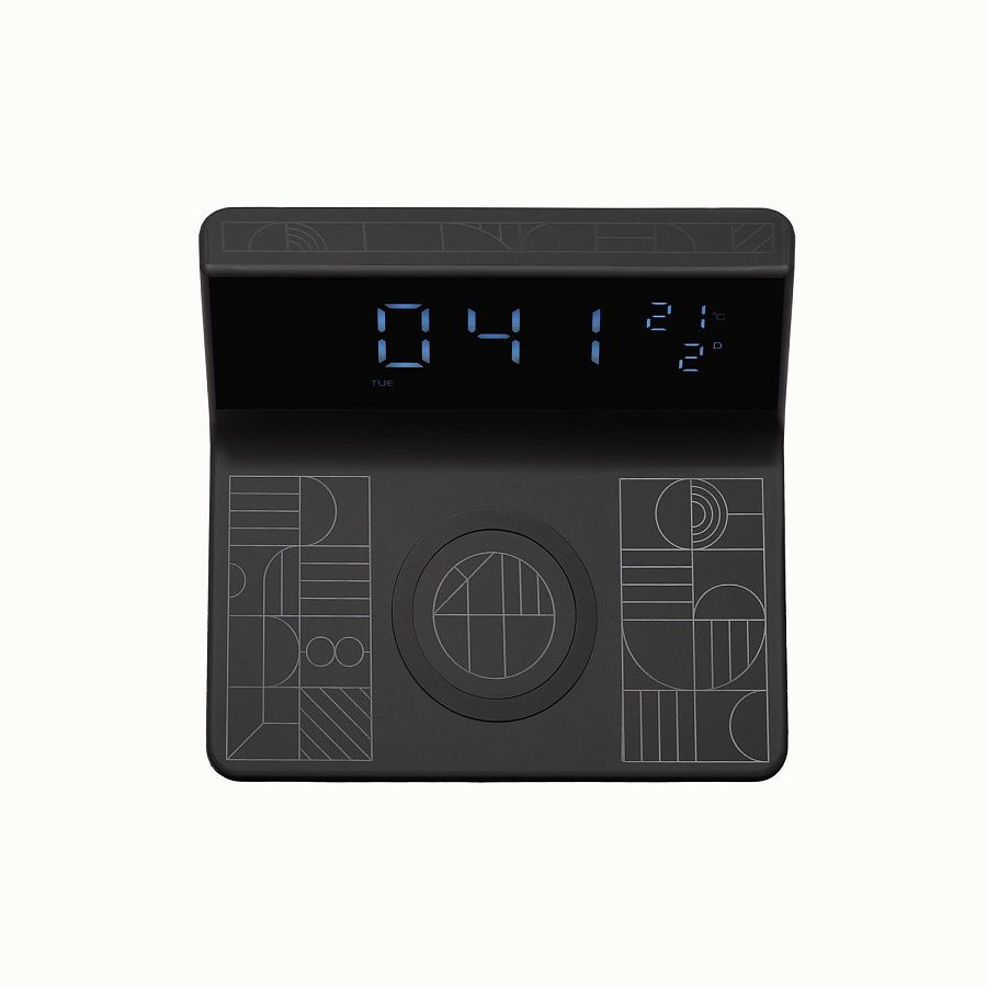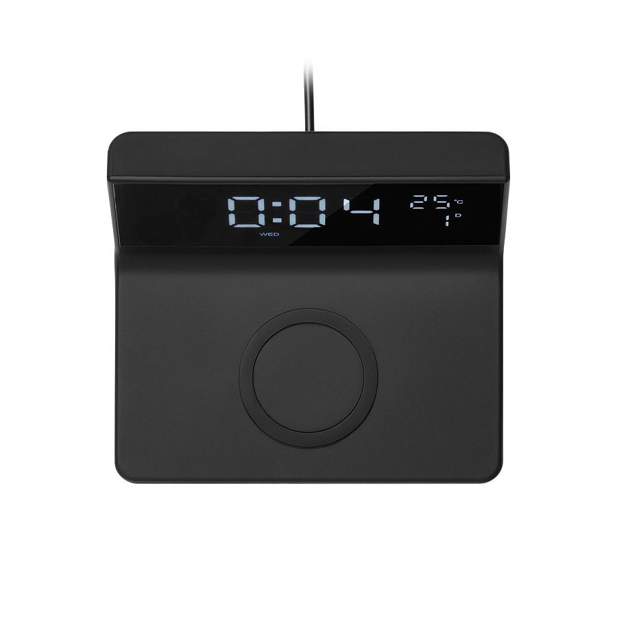 Зарядная станция 15W с часами и будильником. Функция будильника (с возможностью настройки двух будильников и повтора), 12- или 24- формат времени. Четыре уровня яркости дисплея (максимальный, средний, минимум, выключен). Индикаторы зарядки, будильника, даты, температуры. Наличие USB-выхода для обеспечения проводной зарядки устройств. Функция энергосбережения - после отключения питания внутренняя батарейка-«таблетка» сохраняет настройки часов, и после повторного подключения к питанию часы не нужно переустанавливать.