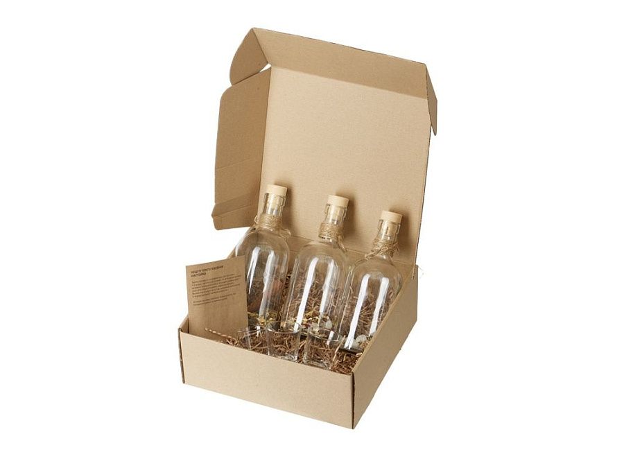 бутылка 0,5 л со смесью апельсиновый микс, бутылка 0,5 л со смесью вермут, бутылка 0,5 л со смесью анисовая, стопка 50 мл- 3 шт, упаковочный материал |