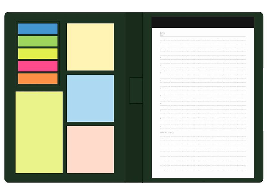 Стикеры выполнены в 3-х размерах: 3 квадратных разноцветных набора (размер: 55х55 мм), 1 набор прямоугольных (размер: 55х95 мм) и набор из 5 разноцветных закладок.