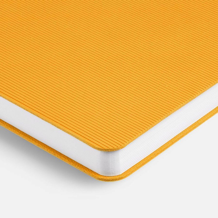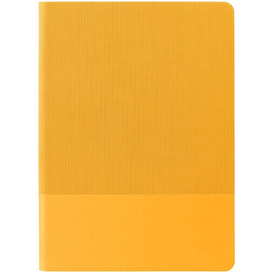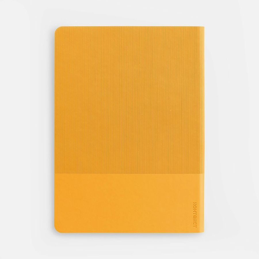 Ежедневник с гибкой обложкой выполнен из материала Soft Touch, желтый KK и Latte, желтый (внутренний материал); дополнен ляссе желтого цвета и фактурным тиснением обложки.
