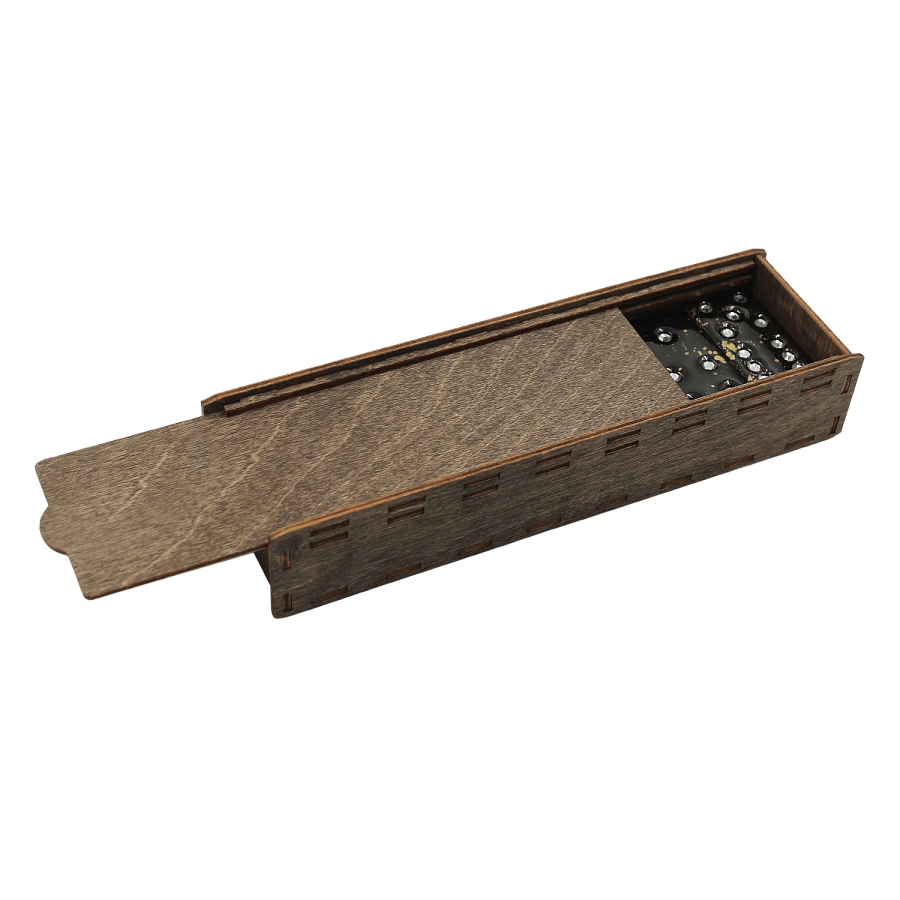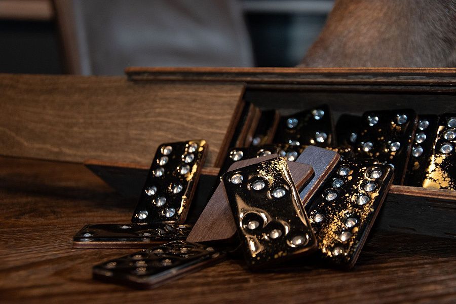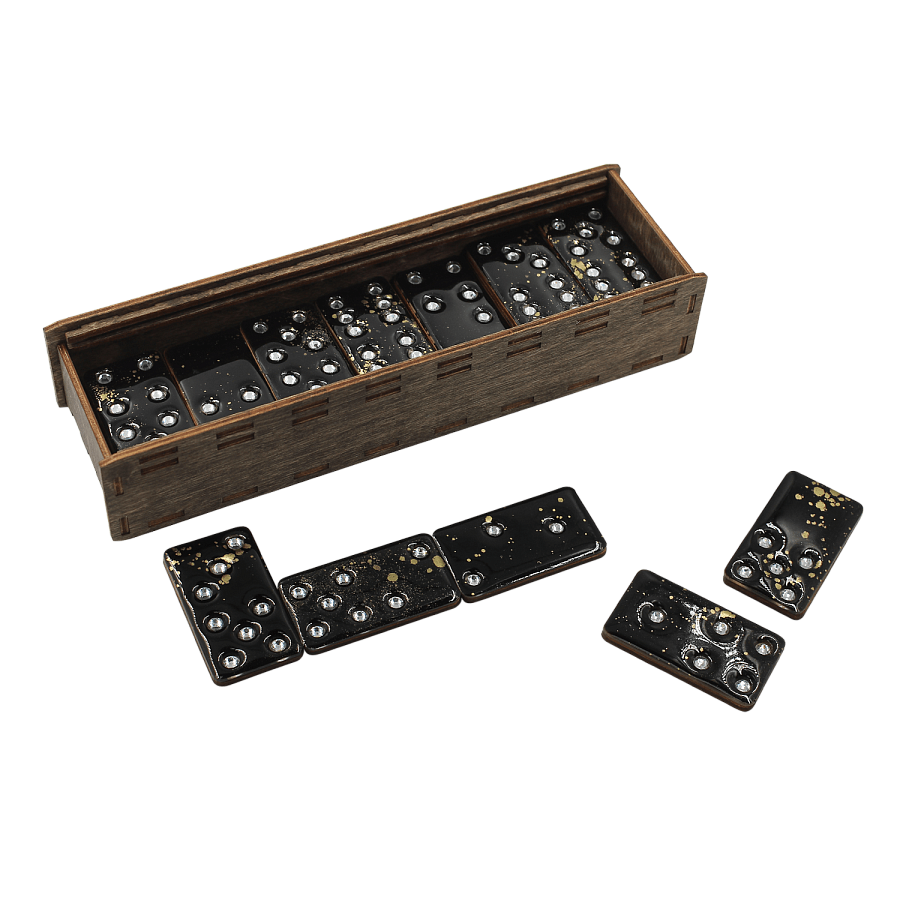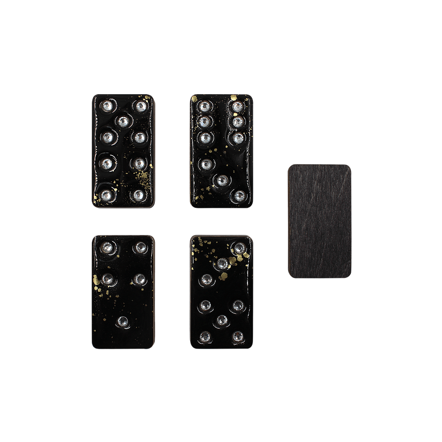 Домино WIN-WIN в стильном деревянном пенале, входит в коллекцию "Русские сезоны".Кости глянцевого черного цвета из дерева и ювелирной смолы с золотыми вкраплениями и стразами произведены вручную. Элегантный и лаконичный дизайн.