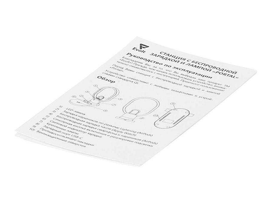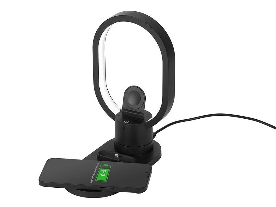 Настольная зарядная станция с лампой для трёх устройств - смартфона с поддержкой беспроводной зарядки, часов Apple и наушников Apple (разъем Lightning). Регулируемый уровень яркости (диммер). Лампу можно вращать вокруг своей оси. Для удобства транспортировки лампу можно отсоединить.