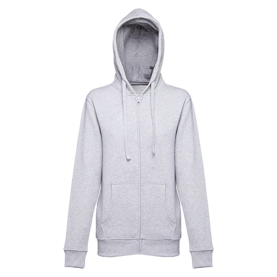 Женская толстовка на молнии, с капюшоном, из трехниточного футера с начесом. Капюшон с подкладкой из кулирной глади и шнуром в цвет основной ткани. Шов горловины и плечевые швы усилены тесьмой. Центральная потайная молния. Карман-кенгуру. Манжеты и низ изделия обработаны рибом 1х1.
