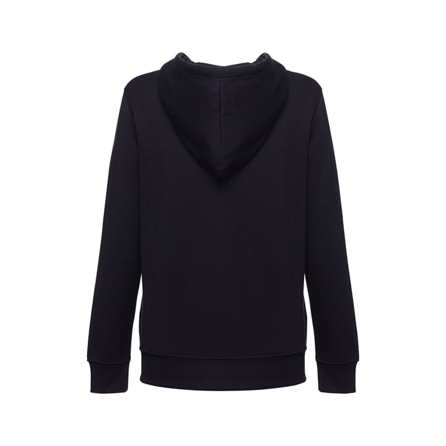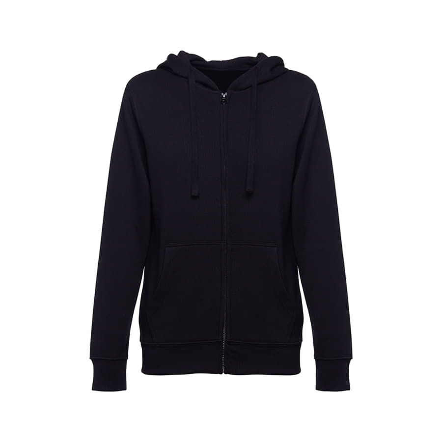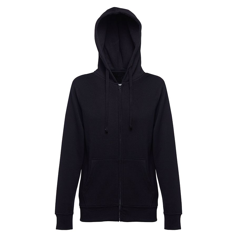 Женская толстовка на молнии, с капюшоном, из трехниточного футера с начесом. Капюшон с подкладкой из кулирной глади и шнуром в цвет основной ткани. Шов горловины и плечевые швы усилены тесьмой. Центральная потайная молния. Карман-кенгуру. Манжеты и низ изделия обработаны рибом 1х1.
