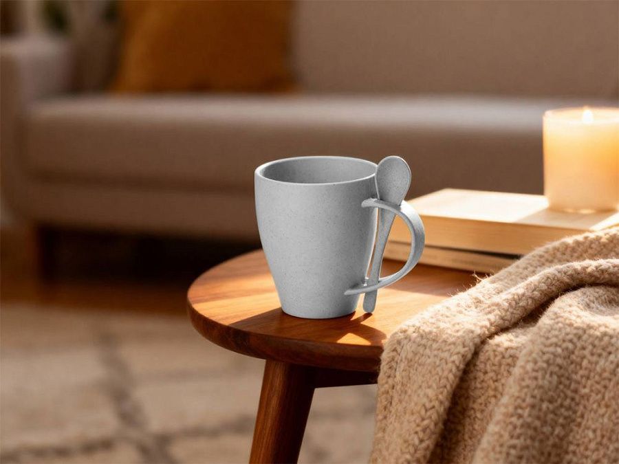 Кружка «Nina» состоит из смеси ПП-пластика (50%) и переработанной пшеницы (50%), что делает ее настоящим экомерчем. Поверхность кружки имеет приятный бежевый оттенок с небольшими вкраплениями-точками темно-серого цвета, которые только подчеркивают природное происхождение «Nina».
