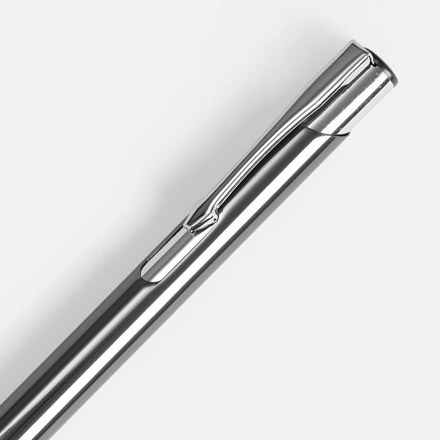 Яркая шариковая ручка с глянцевым цветным корпусом и хромированными деталями.