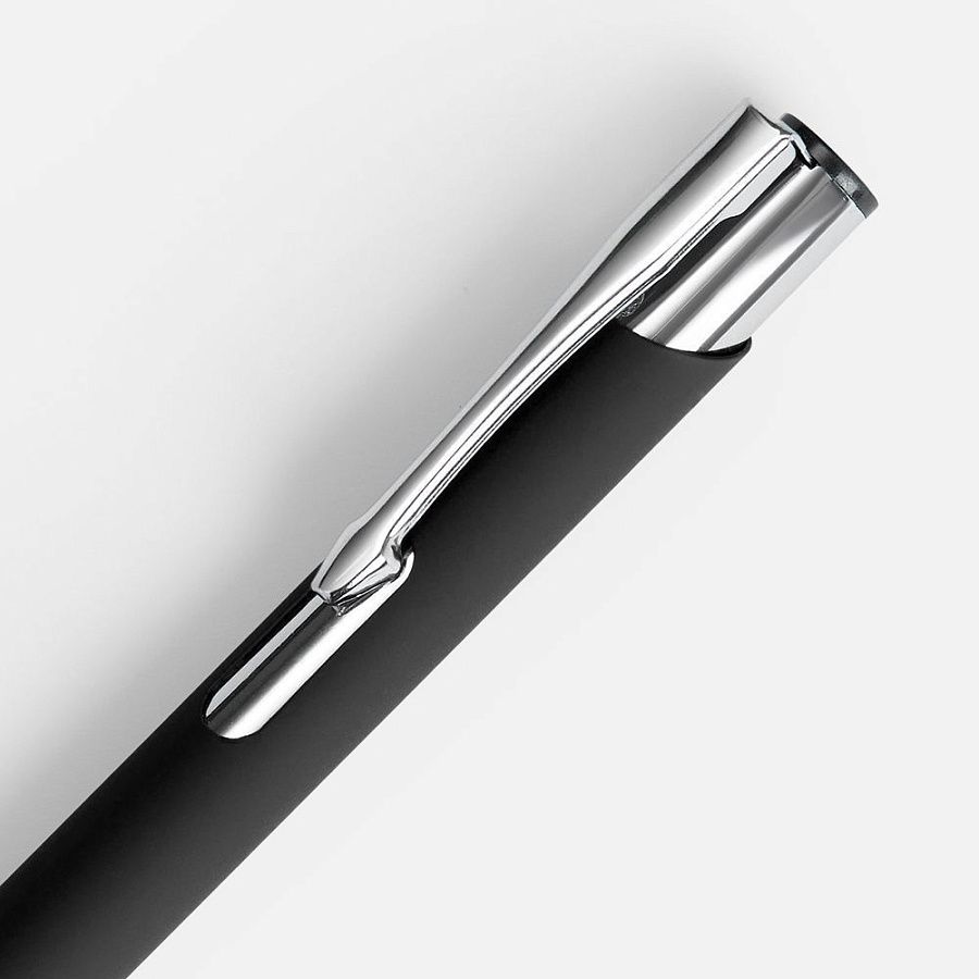 Яркая шариковая ручка с цветным покрытием софт-тач и хромированными деталями.