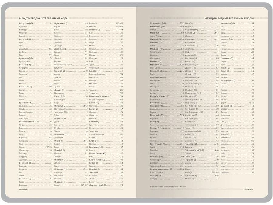 • 19 страниц справочной информации (телефонные коды, буквенные коды, города-миллионники, автомобильные коды, энергетическая и питательная ценность продуктов, национальные праздники, скорость, давление, температура, страны мира, единицы измерения, штрихкоды, термины международной торговли, греческие буквы, размеры одежды, формат бумаги, религиозные праздники, аэропорты Европы, допустимое содержание алкоголя в крови, время распада алкоголя в крови);