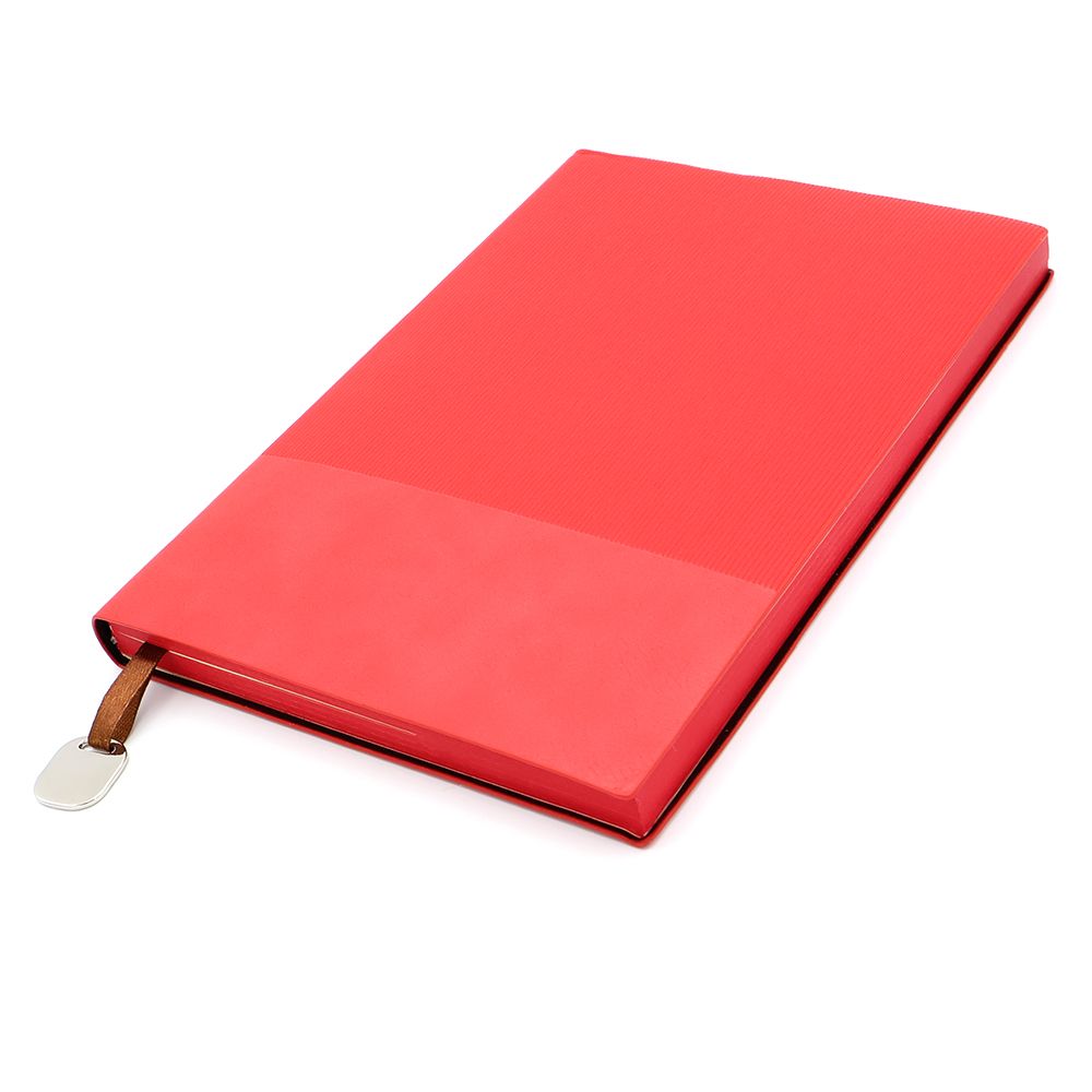 Размеры: 210*145 мм, 240 страниц / 120 листов, страницы разлинеенные, бумага плотностью 80 г/м2. Срез страниц прокрашен в цвет обложки блокнота. В аксессуарах представлены: ляссе c металлической биркой. На бирку можно заказать нанесение логотипа вашей компании.