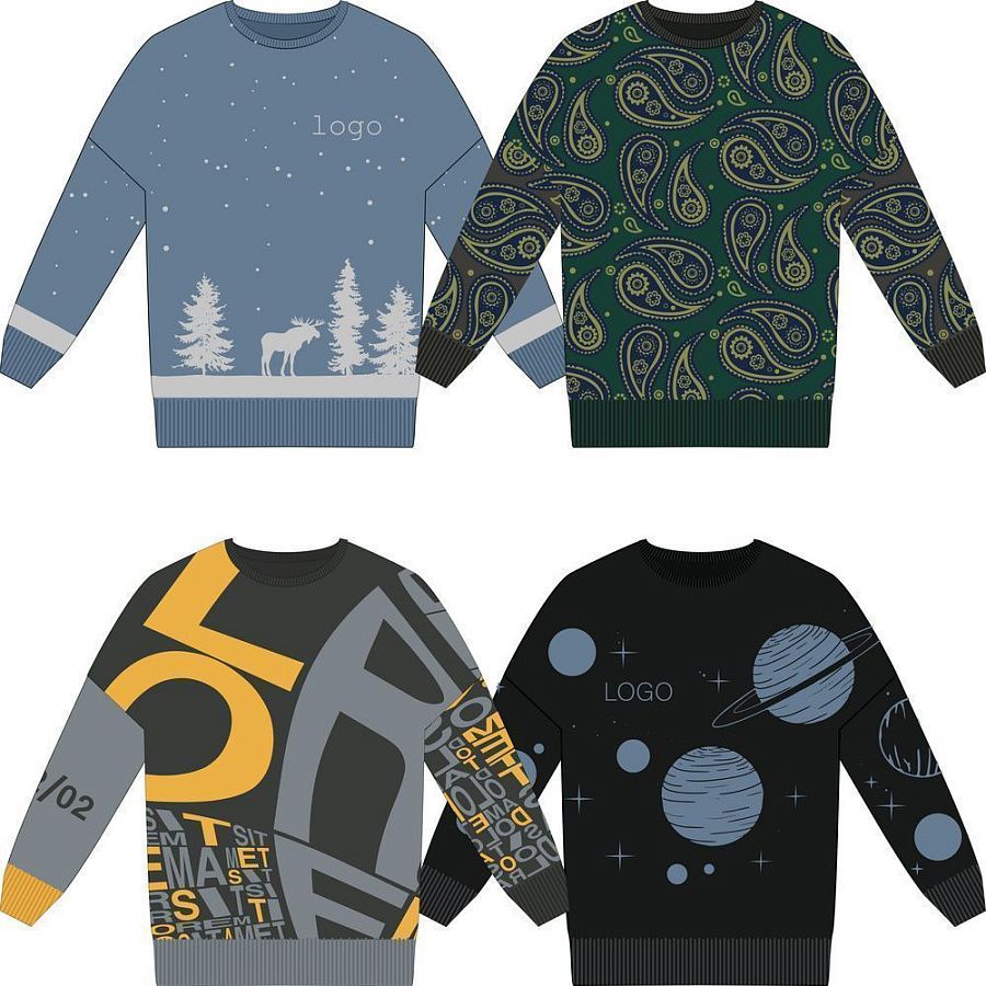 Свитер унисекс с вывязанным логотипом и индивидуальным рисунком в фирменной цветовой гамме.