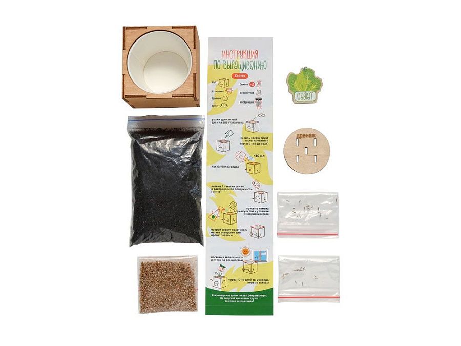 Набор включает: кубический горшок из натуральной берёзовой древесины, семена и специальный питательный грунт, подходящий для конкретного сорта.