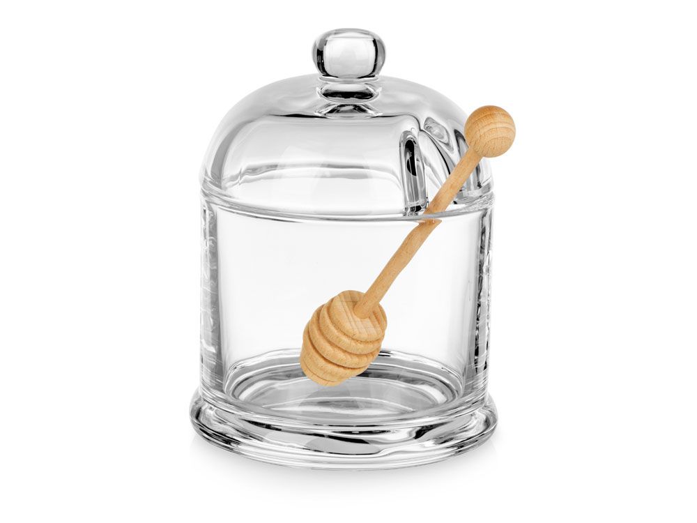 Стеклянная емкость для меда с ложкой точно завоюет место в сердце любителя этого полезного лакомства. Кстати, внутрь можно положить не только мед, но и другие вкусные вещи — варенье, повидло, джемы, которые тоже удобно накладывать ложкой-веретеном.