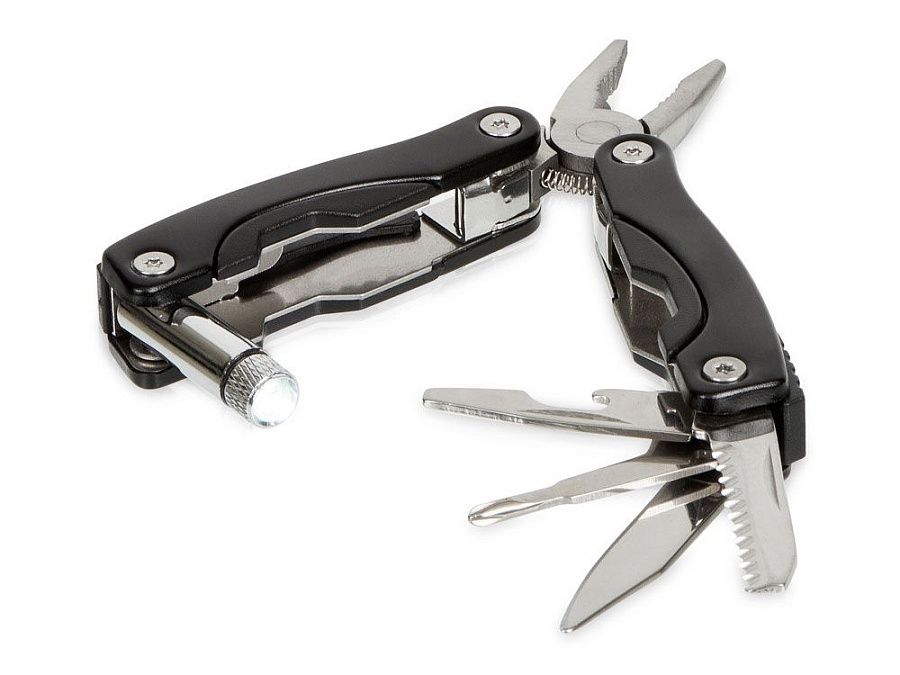 Мультиинструмент с диодным фонариком. В комплекте нейлоновый чехол с петелькой для крепления и застежкой на липучке. Батарейки в комплекте.