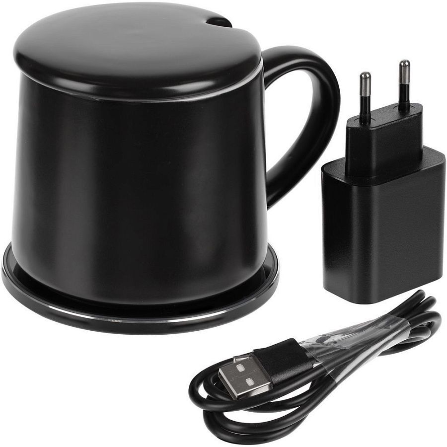 В комплект входят адаптер питания, база для зарядки и керамическая чашка, дно которой выполнено из специальных теплопроводящих материалов.