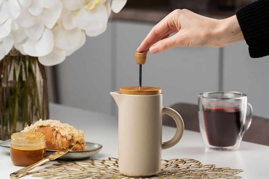 Френч-пресс Keramikk выполнен из керамики, благодаря чему он хорошо сохраняет температуру напитка, не обжигает руки и прост в уходе. Контраст бамбуковой крышки и керамики выглядит действительно интересно и необычно.Емкость 350 мл.