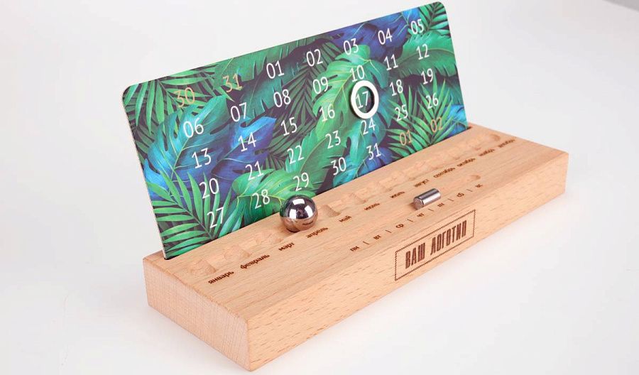 Деревянная подставка изготавливается из дерева светлого или темного цвета. Шариком выставляется месяц, горизонтальным бегунком день недели, а даты выставляются магнитным курсором. Большая площадь под ваш логотип, удобен в использовании, занимает мало места на столе. Календарный блок вы можете выбрать из готовых или заказать со своим индивидуальным дизайном.