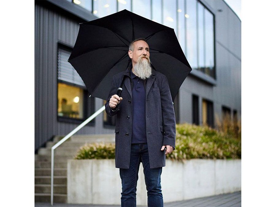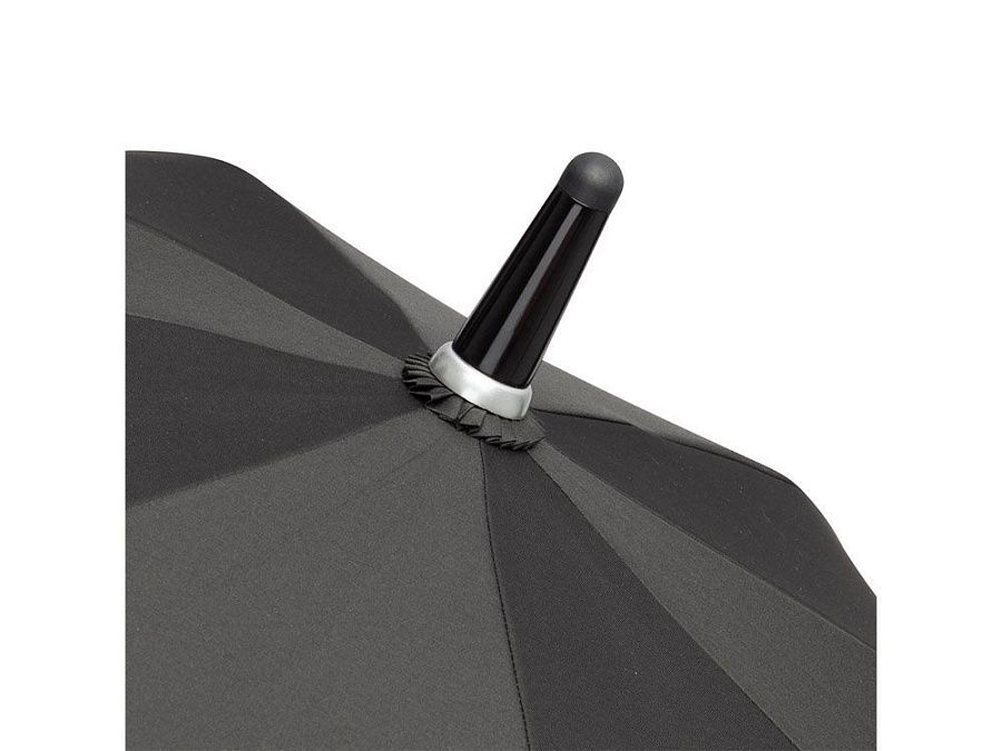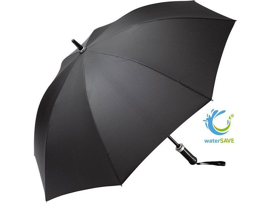 Удобный автоматически открывающийся зонт-трость с уникальной функцией быстрого открытия - нужно потянуть вниз металлическое кольцо на ручке. Купол зонта изготовлен из эпонжа из переработанного пластика, с использованием технологии WaterSAVE, когда окрашивание материала происходит в процессе производства, за счет чего снижает потребление электроэнергии и воды. Высококачественная система защиты от ветра в штормовых условиях обеспечивается гибкими спицами из стекловолокна. Ручка глянцево-черного цвета с хромированными вставками и петлей для переноски. В комплекте чехол, застегивающийся на кнопку.
