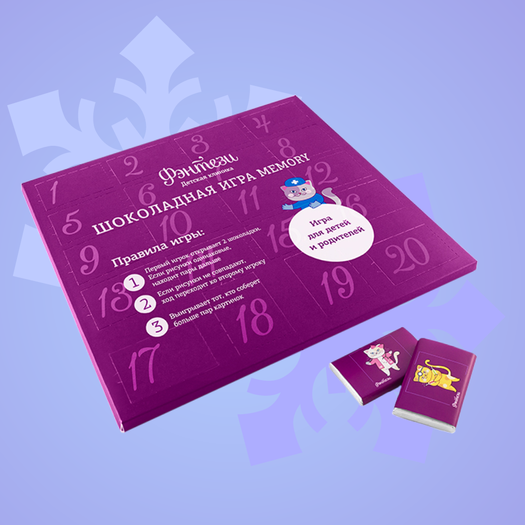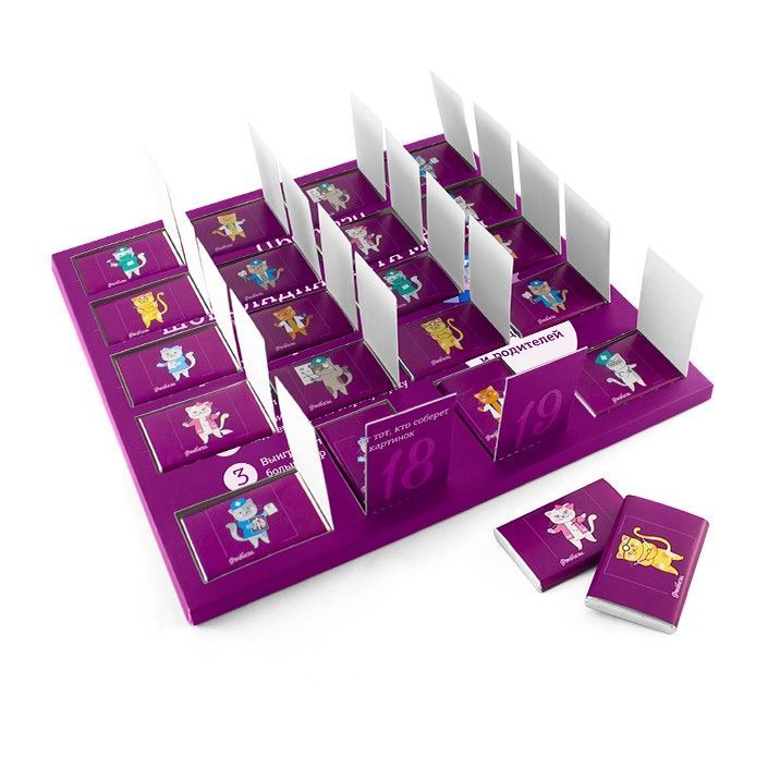 Шоколадный Адвент-календарь с 20 плитками изготавливается на заказ по индивидуальному макету и вашим пожеланиям. По мимо классических видов шоколад есть так же возможность изготовить набор с любым даже экзотическими видами шоколада. Шоколадные плитки в наборе упакованы в фольгу, цвет которой вы можете выбрать из нашего широкого ассортимента, поверх фольги плитка упакована в индивидуальную этикетку, так же с брендированием.