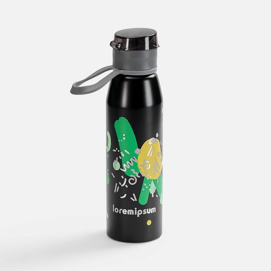Легкая бутылка для спорта с откидной крышкой и силиконовой петлей для удобной транспортировки.