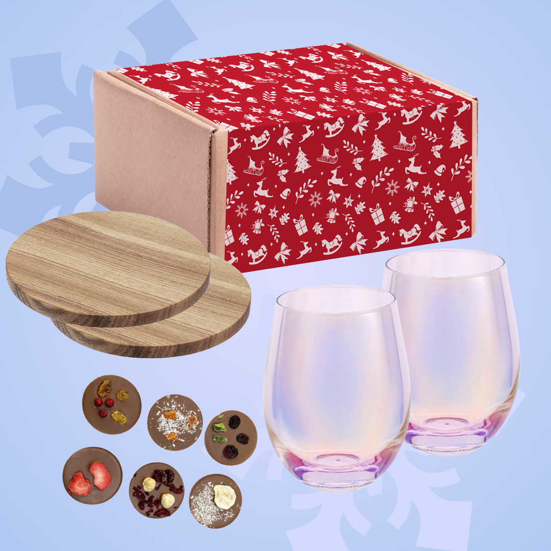 В наборе 2 бокала из стекла с перламутровый наполнением, легкие, элегантные и очень красивые. Два костера из натурального дерева станут прекрасным рекламным носителем и заботливым напоминанием о вашей компании. Набор из натурального шоколада с разными добавками послужит отличным жестом внимания.
