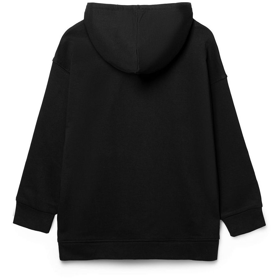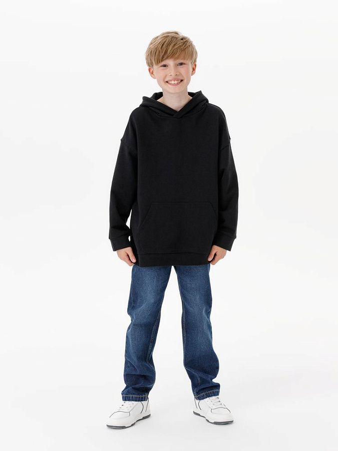 Детское худи оверсайз со спущенным плечом и карманом-кенгуру.