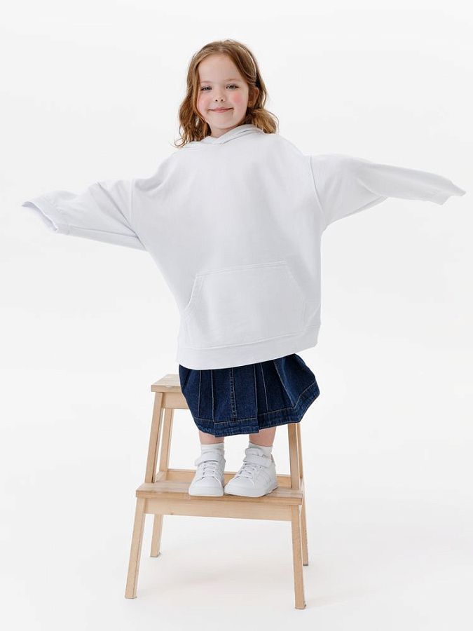 Детское худи оверсайз со спущенным плечом и карманом-кенгуру.