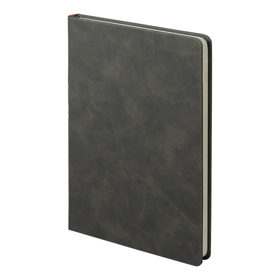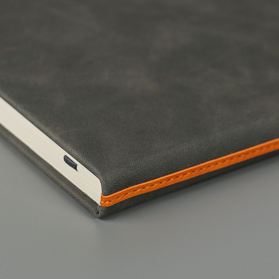 Ежедневник недатированный MuseЦвет обложки темно-серый, декоративная полоса, цвет оранжевыйРазмер 130*210 мм, переплет твердыйОбложка термоактивный PU, с эффектом замшиБлок недатированный, в линейку, скругленные углыБумага кремовая, плотность 70 г м2Форзац нахцаз кремовые272 страницыЛяссе, 7 мм, в цвет обложкиУпаковка крафтовый сливбокс