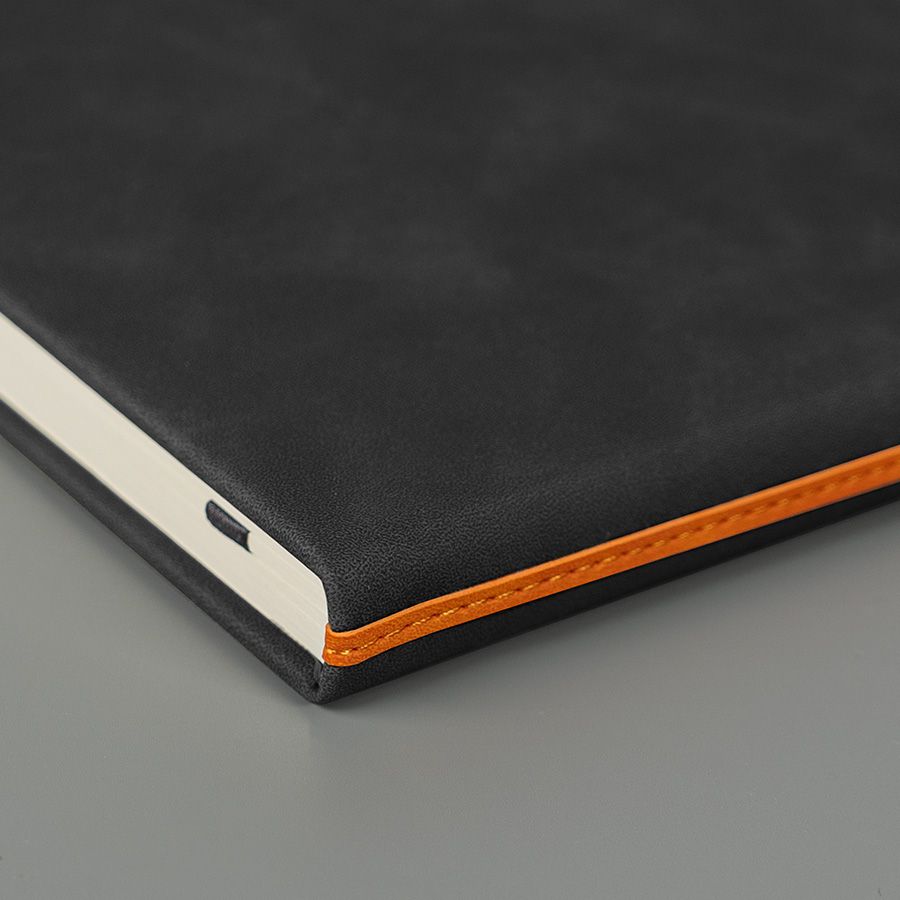 Ежедневник недатированный MuseЦвет обложки черный, декоративная полоса, цвет оранжевыйРазмер 130*210 мм, переплет твердыйОбложка термоактивный PU, с эффектом замшиБлок недатированный, в линейку, скругленные углыБумага кремовая, плотность 70 г м2Форзац нахцаз кремовые272 страницыЛяссе, 7 мм, в цвет обложкиУпаковка крафтовый сливбокс