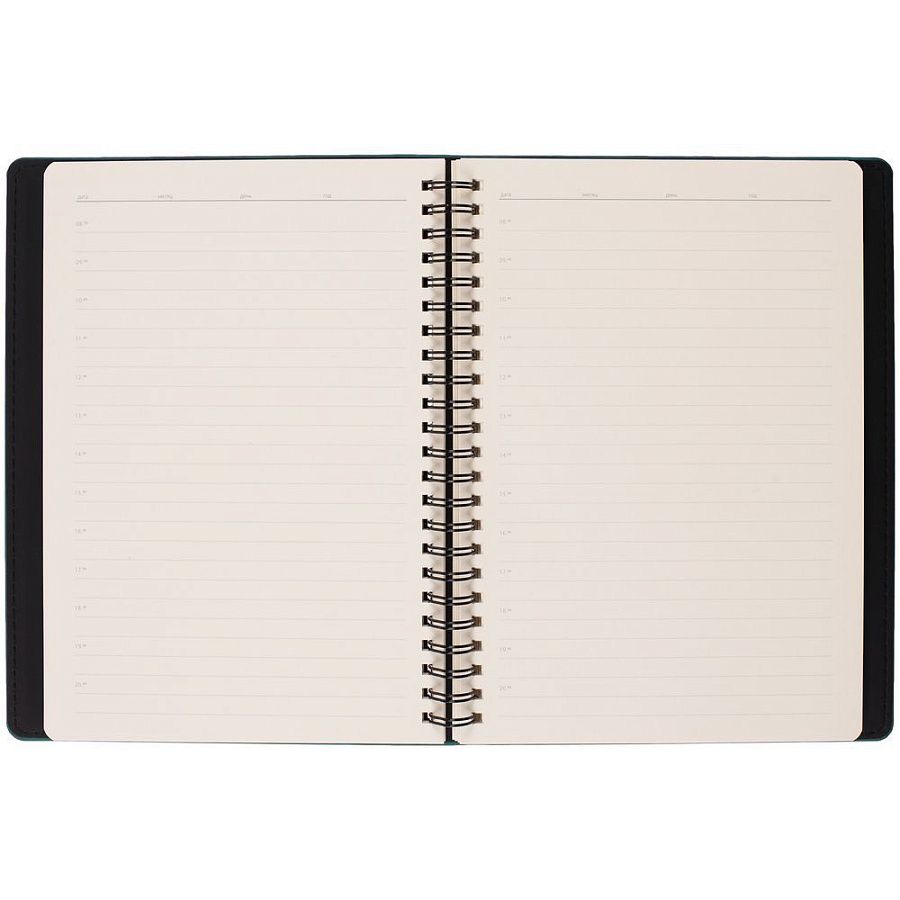 Ежедневник с блоком на пружине в твердой обложке, выполнен из материалов Nubuk Touch, темно-зеленый VV и Soft Touch, черный AA.