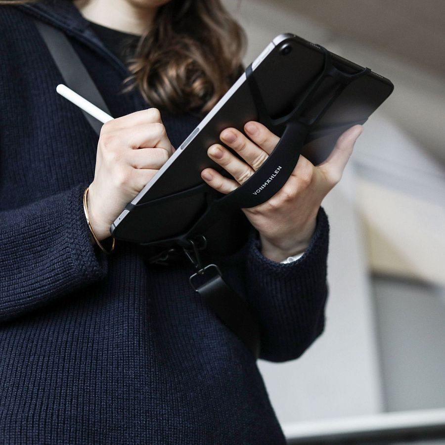 Универсальный ремешок-держатель VONMAHLEN Infinity Max совместим с большинством современных планшетов диагональю от 8 до 11 дюймов. Усиленная ручка по центру изделия обеспечивает надежный и прочный захват. Infinity Max не препятствует использованию функций планшета, поскольку камера и кнопки остаются в легком доступе. Продуманный дизайн позволяет надеть аксессуар за считанные секунды. Длина ремешка регулируется и достигает 170 см. Кстати, благодаря этому Infinity Max можно использовать не только горизонтально, но и вертикально. Еще одна фишка — аксессуар подходит для крепления планшета на спинку автомобильного кресла.