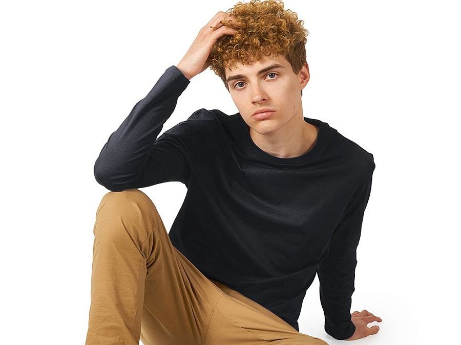 Футболка с длинным рукавом комфортной посадки с боковыми швами. Горловина обработана рибом 1х1 и тесьмой по спинке. Футболка выполнена из хлопкового джерси.