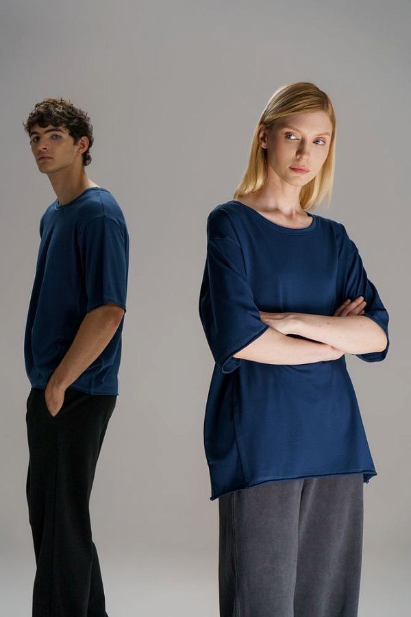 Футболка унисекс свободной посадки Vozduh создана для тех, кто следит за трендами и ценит комфорт. Необработанные края рукавов и низа изделия добавляют ему оригинальности и легкой небрежности, а боковые вставки создают притягательный летящий силуэт.