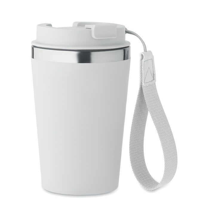 Термокружка с двойными стенками из переработанной нержавеющей стали (90%) и обычной нержавеющей стали (10%) с внешним покрытием из переработанного полипропилена с ремешком для запястья из RPET. Объем: 350 мл. Герметична.