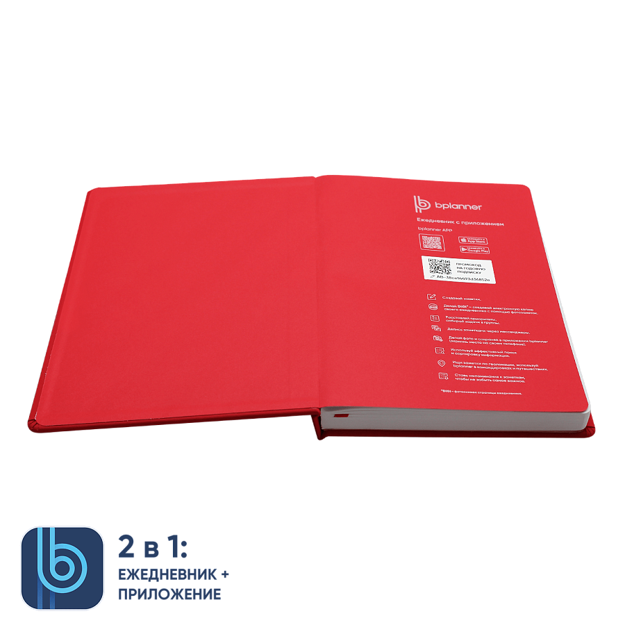 Bplanner 02— вторая модель ежедневников Bplanner изготовлена из экокожи в фактуре софт-тач. Ежедневники изготовлены в твердой обложке, цветной форзац и нахзац и ляссе в цвет обложки. Ежедневник подходит для УФ печати и тиснения логотипа компании. На форзаце ежедневника расположен qr-код, который активирует годовой доступ к мобильному приложению Bplanner.