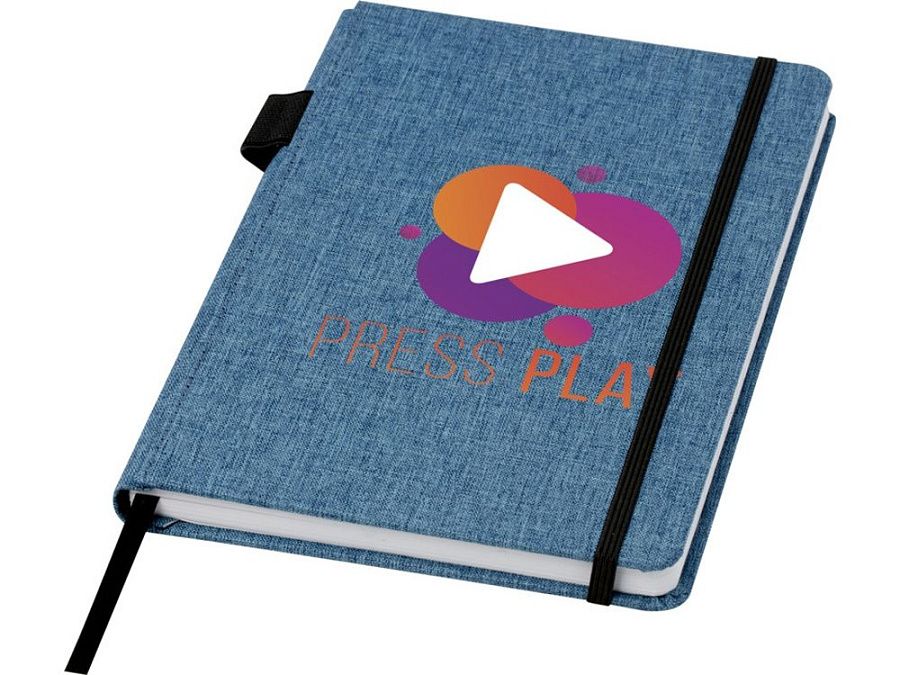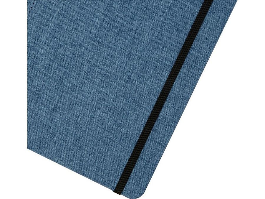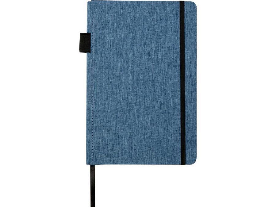 Блокнот формата А5 с отделкой из переработанного ПЭТ. Содержит 96 листов в линию плотностью 70 г/м², изготовленных из переработанной бумаги, с петлей для ручки и лентой-закладкой. В упаковке из картона.
