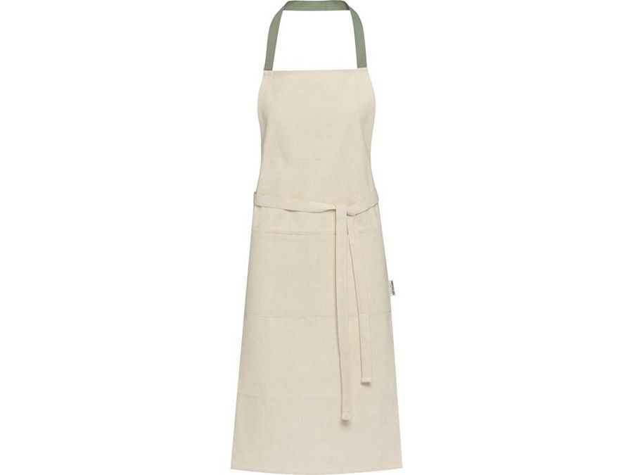 Фартук Nia изготовлен из 100% сертифицированного GRS переработанного хлопка плотностью 200 г/м². Этот фартук из натурального хлопка с контрастной петлей на шее защитит вашу одежду во время приготовления пищи. Фартук Nia с двумя соседними карманами общим размером 45 x 20 см и завязками длиной 1 метр обеспечивает обеспечивает практичность и стиль на вашей кухни. GRS certified recycled cotton, 210 g/m2.