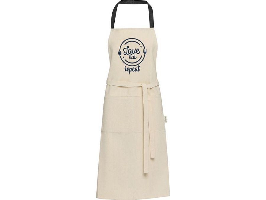 Фартук Nia изготовлен из 100% сертифицированного GRS переработанного хлопка плотностью 200 г/м². Этот фартук из натурального хлопка с контрастной петлей на шее защитит вашу одежду во время приготовления пищи. Фартук Nia с двумя соседними карманами общим размером 45 x 20 см и завязками длиной 1 метр обеспечивает обеспечивает практичность и стиль на вашей кухни. GRS certified recycled cotton, 210 g/m2.