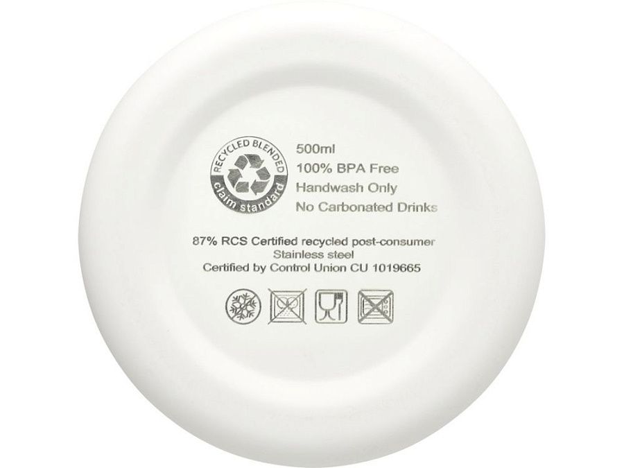 Бутылка из нержавеющей стали, сертифицированная RCS, с медной вакуумной изоляцией и лаконичным дизайном. Изолированная конструкция из нержавеющей стали предотвращает образование конденсата внутри бутылки, а модное матовое порошковое покрытие делает бутылку особенно прочной. Не содержит БФА, протестирована и одобрена в соответствии с немецким законодательством о безопасности пищевых продуктов (LFGB). Проверена на содержание фталатов и одобрена для использования в соответствии с правилами REACH. Объем 500 мл. Рекомендуется мыть вручную. Поставляется в подарочной коробке из переработанного картона. Recycled stainless steel.