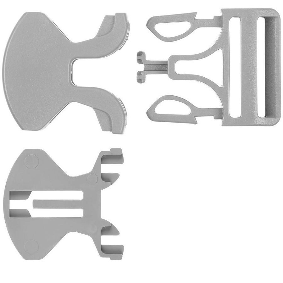 Особенность этой пряжки в том, что она состоит из 3 частей, две из которых крепятся напрямую на изделие, и для их установки необходим специальный инструмент. Третья деталь фиксируется на стропе.