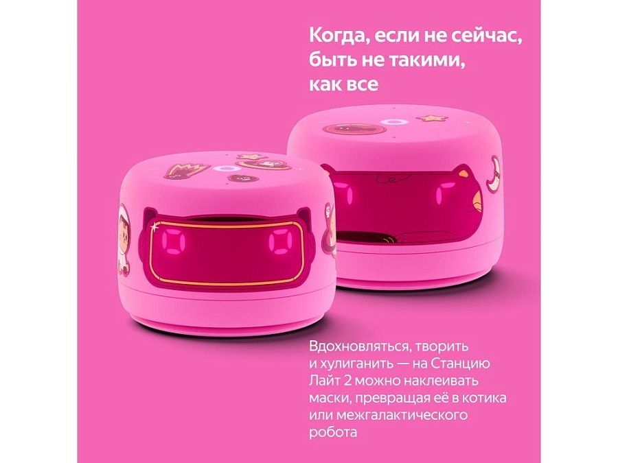 Вдохновляться, творить и хулиганить — на Станцию Лайт 2 можно наклеивать маски, превращая её в котика или межгалактического робота. А стикерами из набора здорово украшать и умную колонку, и всё вокруг.