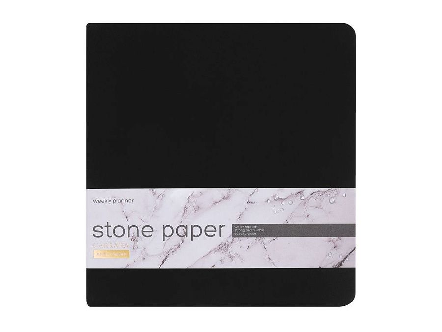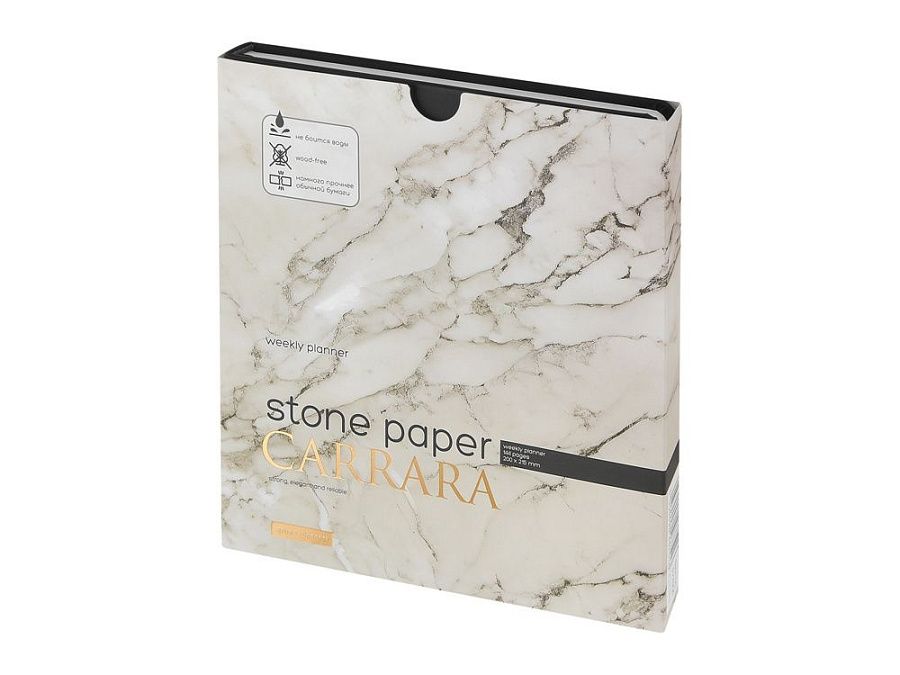 Блок произведен из каменной бумаги плотностью 144 г/кв.м, отличающейся особой гладкостью и повышенной прочностью. Она не боится воды и пролитого кофе, достаточно просто протереть сухой салфеткой.