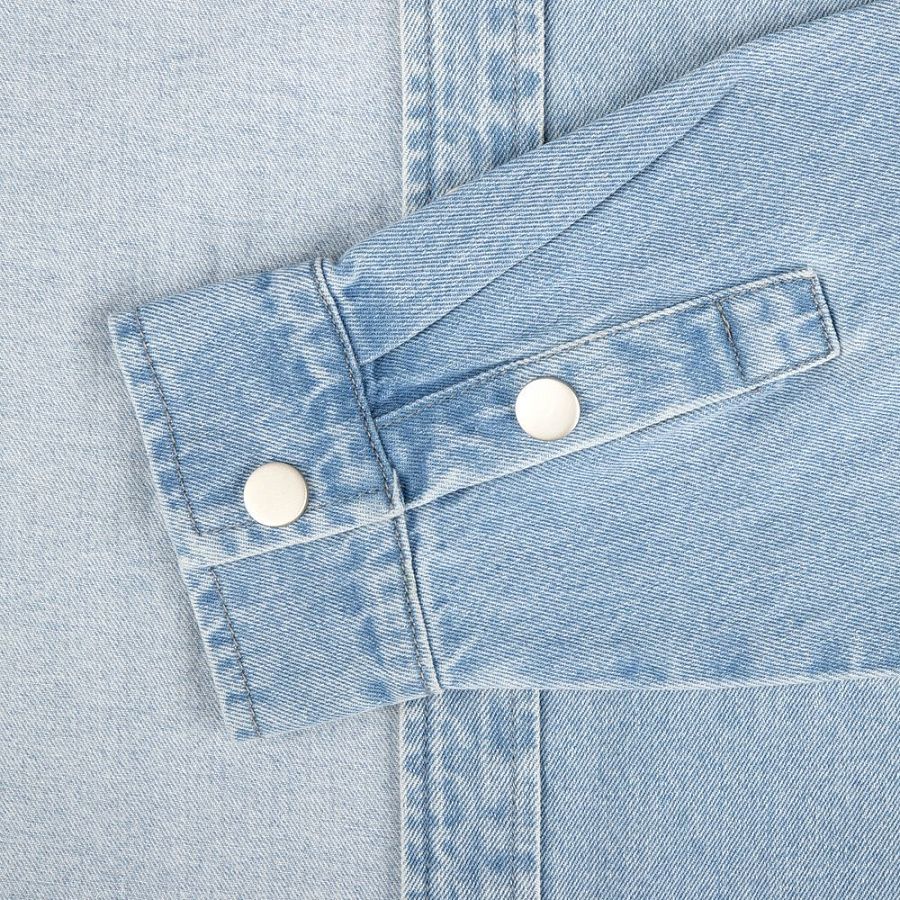 Джинсовая куртка-рубашка унисекс на кнопках прямого силуэта.