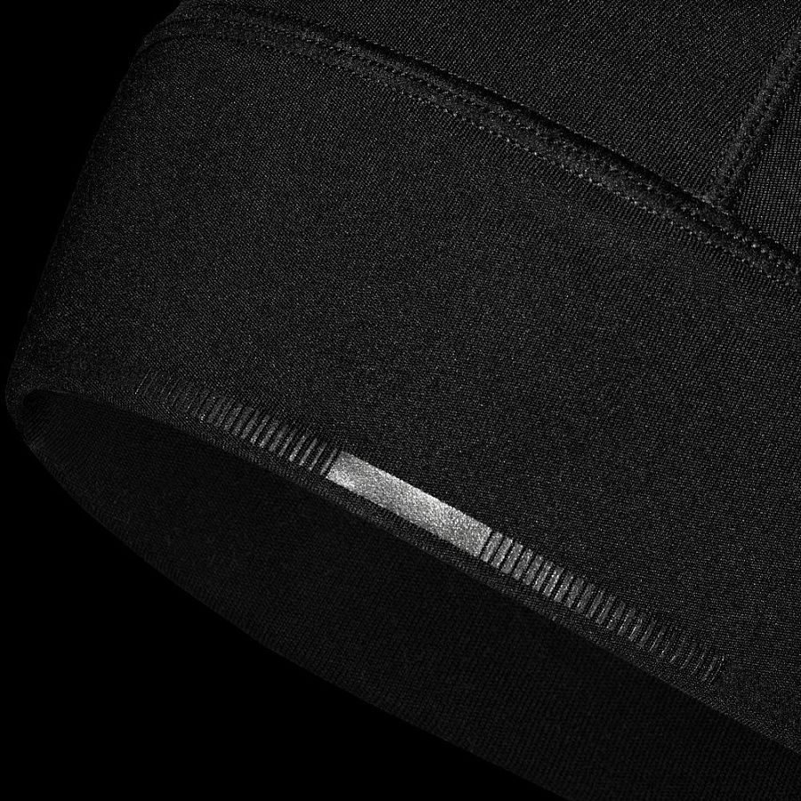Шапка выполнена в черном цвете, но имеет светоотражающую полосу вдоль края, что улучшает видимость спортсмена в условиях плохой освещенности.