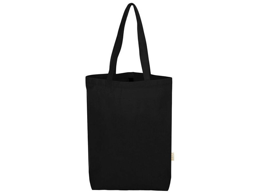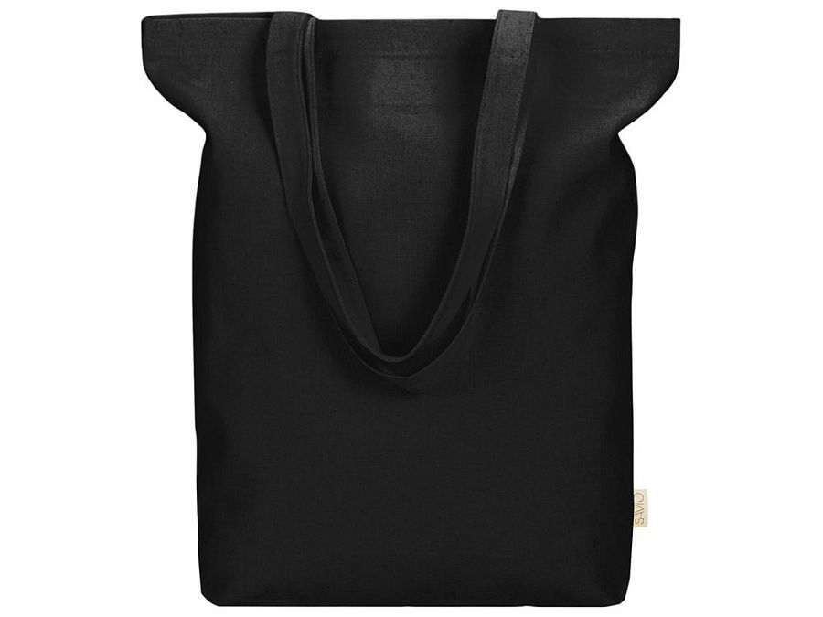 Удобная сумка-шоппер из переработанного хлопка. Можно хранить в сложенном виде и фиксировать с помощью эластичной ленты, застегивающейся на кнопку.