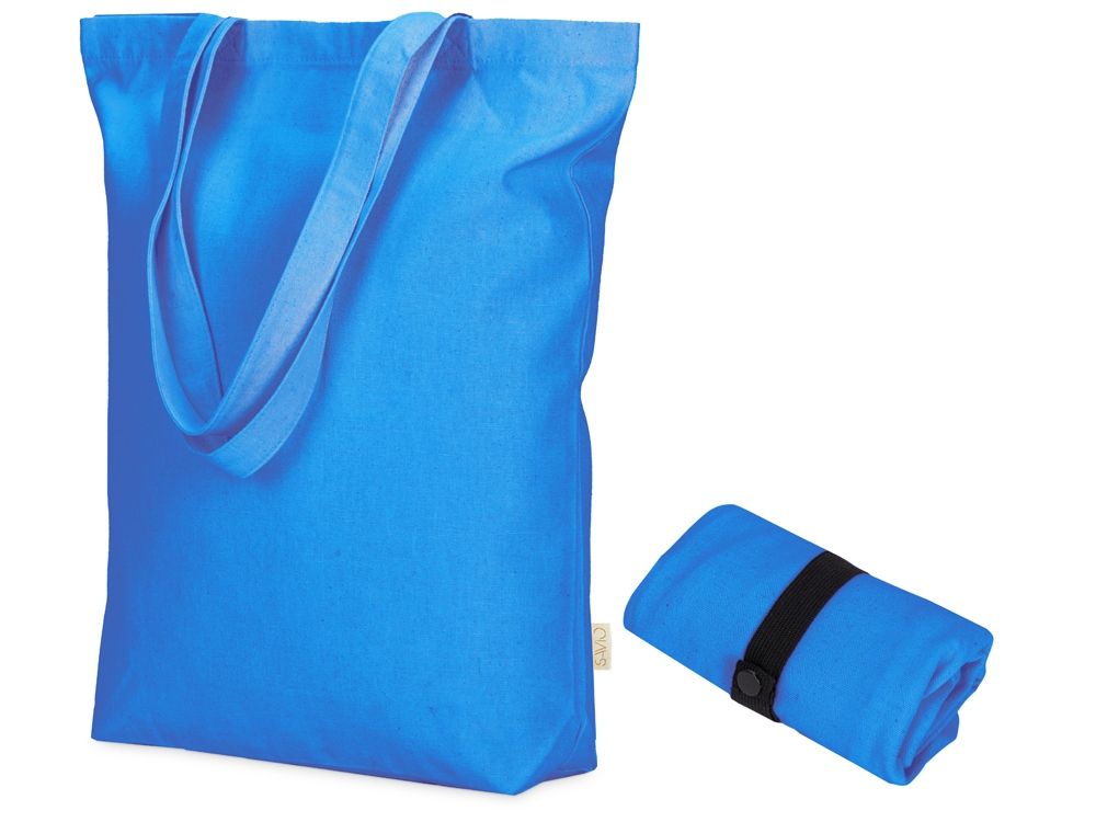 Удобная сумка-шоппер из переработанного хлопка. Можно хранить в сложенном виде и фиксировать с помощью эластичной ленты, застегивающейся на кнопку.
