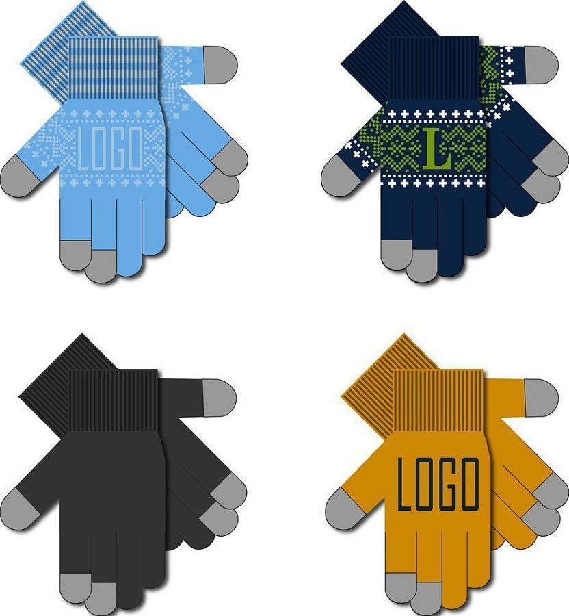 Модель: цельновывязанные бесшовные перчатки с эластичной манжетой и жаккардовым узором в 2-3 цвета. Три пальца: средний, указательный, большой — вяжутся с использованием токопроводящей нити. Манжета может быть полосатой (только горизонтальные полосы 1-2 цветов, без узора и логотипа).