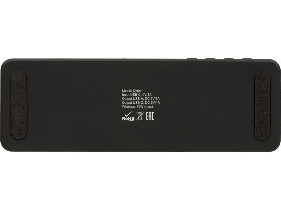Посередине корпуса расположена беспроводная зарядка для смартфонов мощностью 10 Вт, а также два дополнительных зарядных разъёма USB-A и USB-C. Кабель с поддержкой быстрой зарядки в комплекте.
