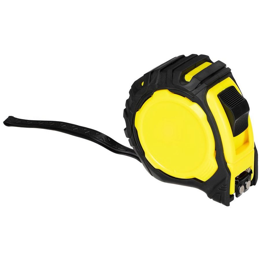 Длина измерительной ленты 5 метров позволяет работать на больших расстояниях. Лента оснащена магнитным наконечником для надежного сцепления с металлическими поверхностями. Корпус рулетки выполнен из прочного пластика с накладкой из ПВХ, которая предотвращает скольжение инструмента в руке.